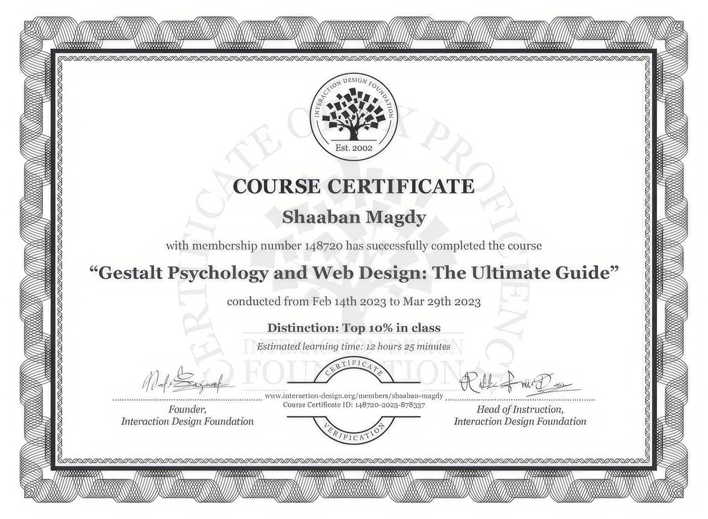 The Certificate below verifies that Shaaban Magdy has completed the course Gestalt Psychology and Web Design: The Ultimate Guide with a Top 10% Distinction.