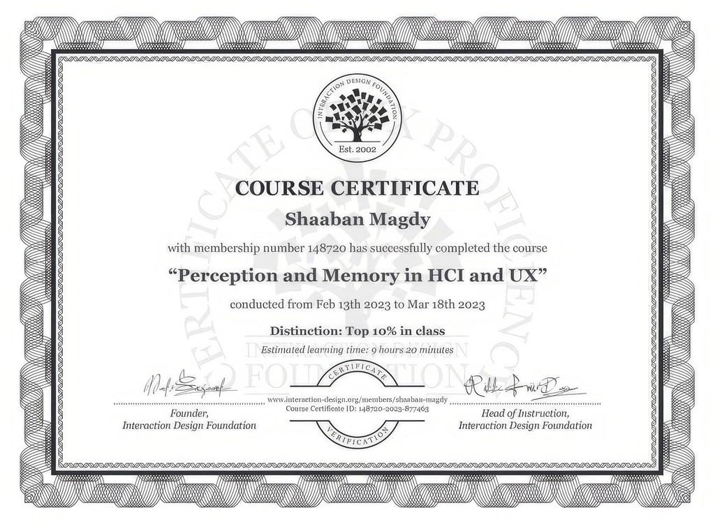 The Certificate below verifies that Shaaban Magdy has completed the course Perception and Memory in HCI and UX with a Top 10% Distinction.
