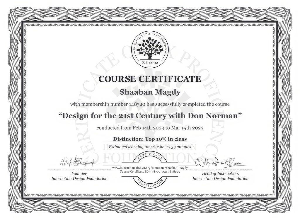 The Certificate below verifies that Shaaban Magdy has completed the course Design for the 21st Century with Don Norman with a Top 10% Distinction.