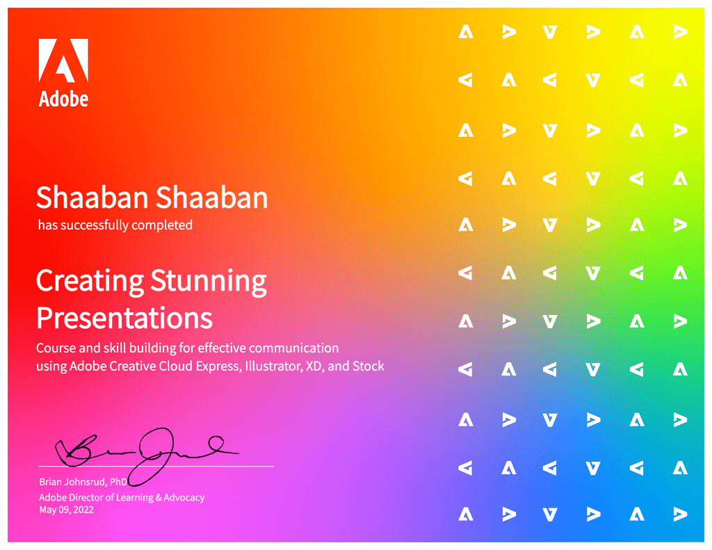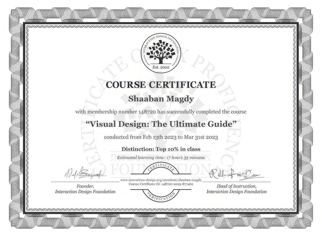 The Certificate below verifies that Shaaban Magdy has completed the course Visual Design: The Ultimate Guide with a Top 10% Distinction.