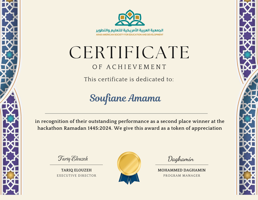 شاركت كـ Backend Developer في هاكاثون تقني في رمضان، وتمكنا من تحقيق المرتبة الثانية بين الفرق المشاركة.