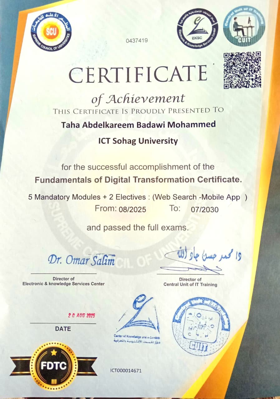 الحصول على دورة التحول الرقمي المقدمة من جامعة سوهاج، والتي تركز على تقديم المعرفة في مجال أساسيات الحاسوب والشبكات، بالإضافة إلى التعامل مع برامج الإنتاجية المختلفة مثل برامج الأوفيس