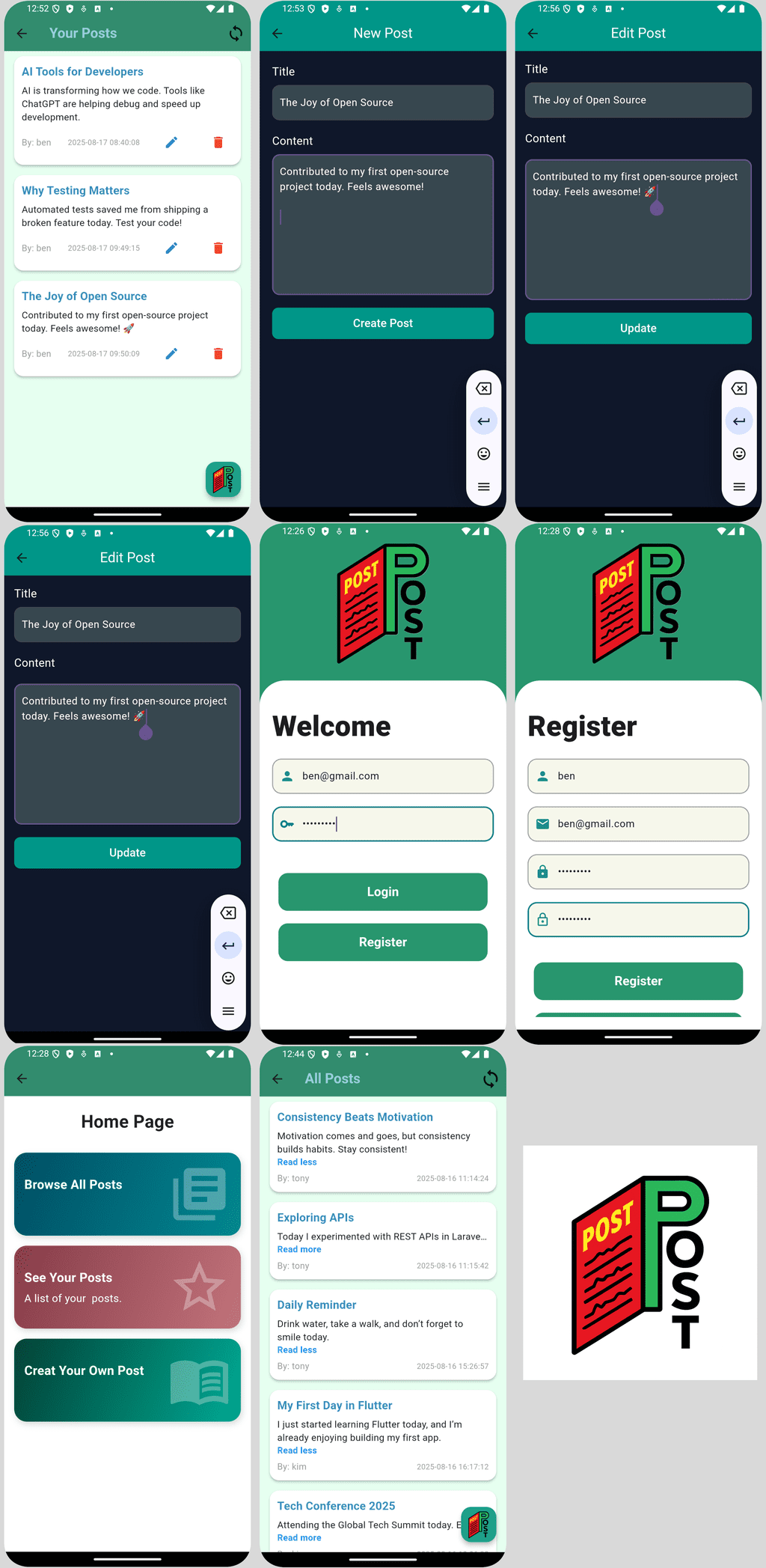 dashboard using Blade for managing posts and users. The Flutter app enables users to register,