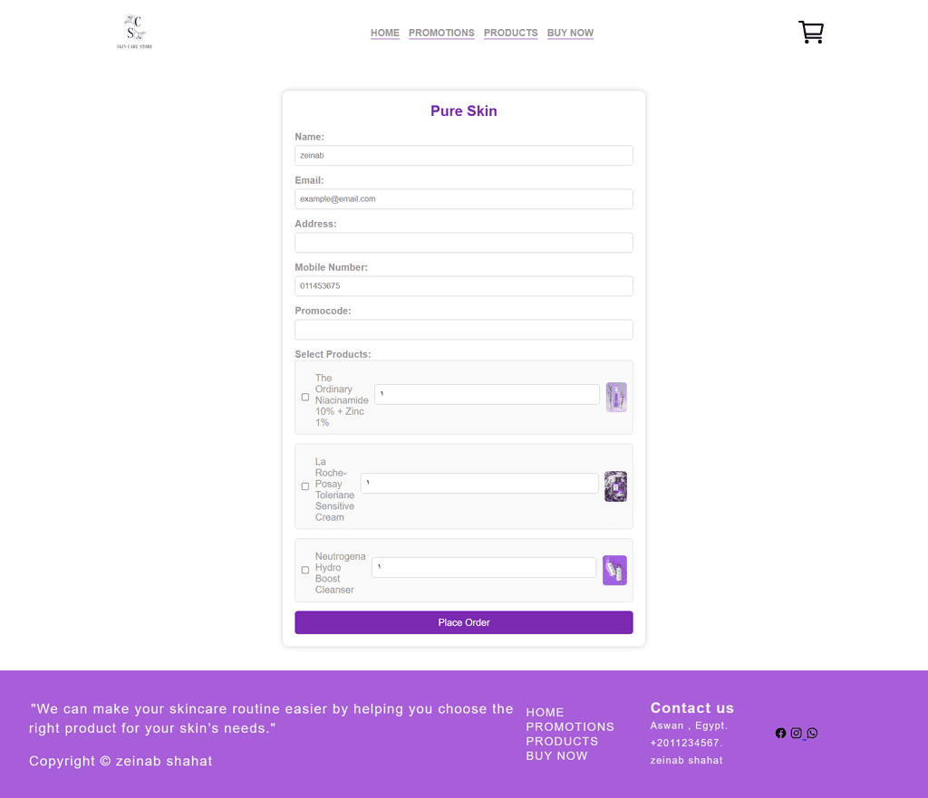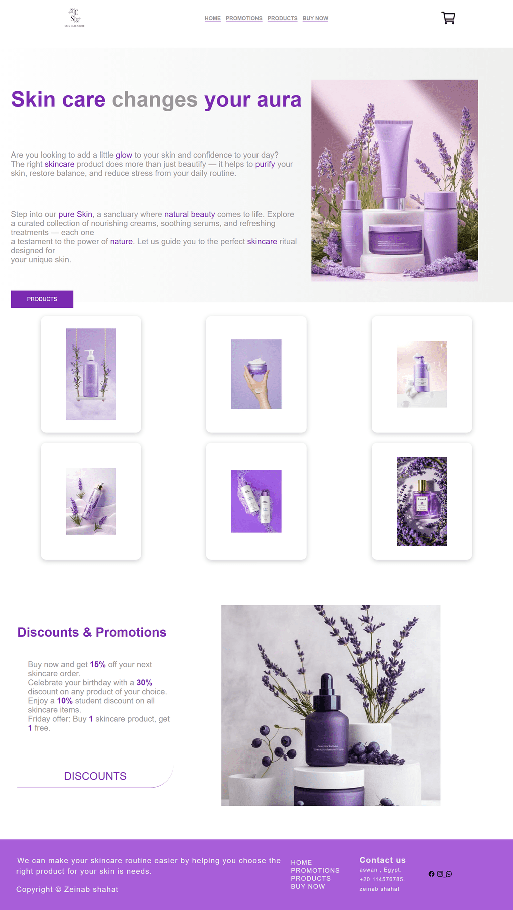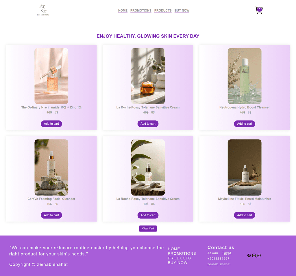 تطوير مشروع " موقع ويب لمنتجات العناية بالبشرة": موقع تفاعلي يعرض منتجات للبشره باستخدام HTML, CSS, JavaScript.