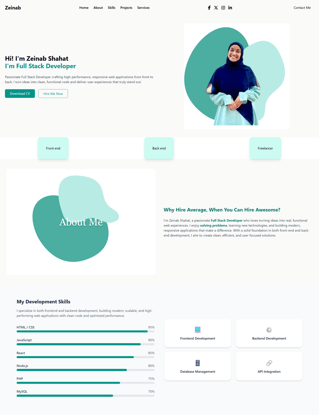 أنا زينب شحات، مطورة ويب شغوفة بخبرة في HTML, CSS, JavaScript، ولدي مهارات متقدمة في PHP (OOP), WordPress, وMySQL. حصلت على تدريب عملي في معهد تكنولوجيا المعلومات (ITI) – فرع أسوان مما عزز خبرتي في تطوير المواقع وإدارتها. أتميز بالقدرة على التفكير النقدي، وحل المشكلات، والعمل الجماعي، وأسعى دائمًا لبناء مواقع احترافية، سهلة الاستخدام، ومتوافقة مع احتياجات العملاء، مع الاستمرار في تطوير مهاراتي التقنية بشكل مستمر.